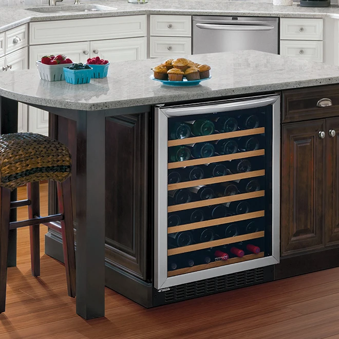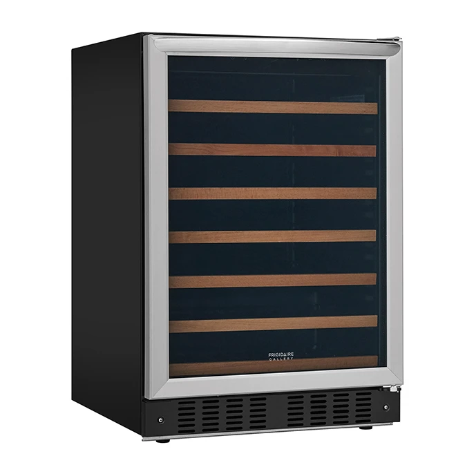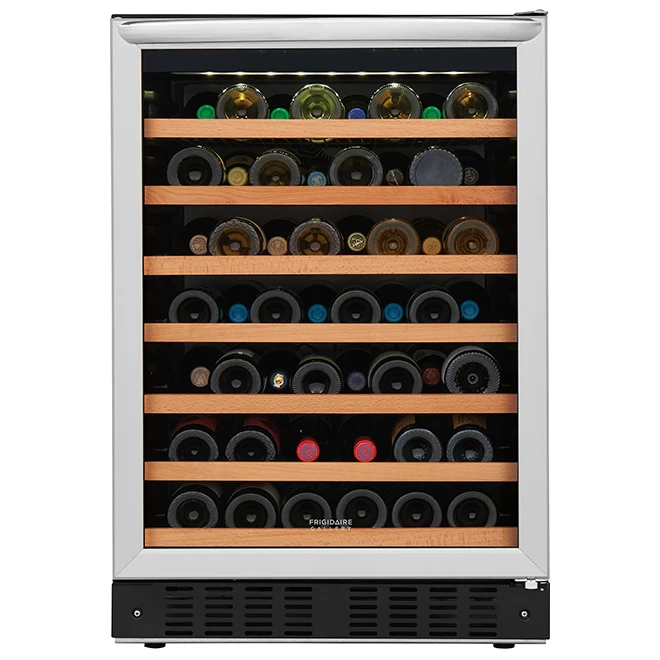Chill your collection of wine with this stylish wine cooler by Frigidaire(R). This product is part of the Gallery collection and can store 52 bottles or 12 oz. cans. It features convertible wood trim shelves, a see-thru door and LED lighting for visibility. The interior temperature can be adjusted depending on your needs. Backed by a 1-year limited warranty on labour/parts included.