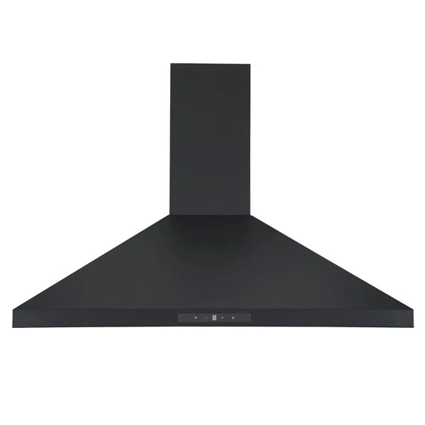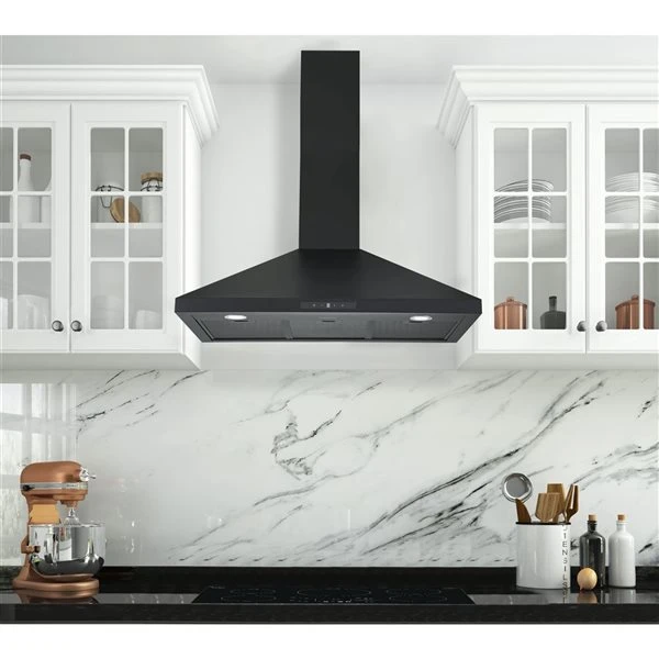 - 36-inch wall mount pyramid range hood constructed in stainless steel with a matte black finish