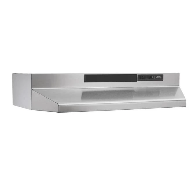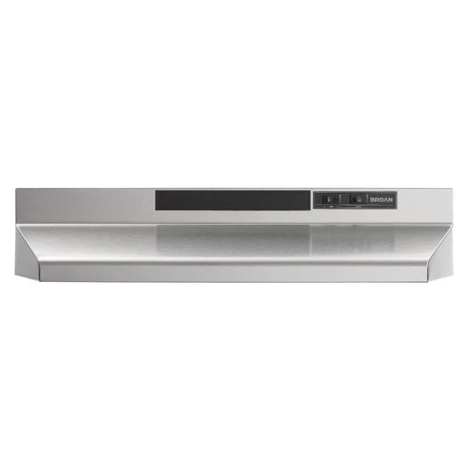 Improve your home kitchen’s air quality with this Broan under-cabinet range hood. This model allows horizontal, vertical, round and non-ducted orientation to adjust to any kitchen layout. The stainless steel, under-cabinet range hood is durable and anti-corrosive, which makes it a lasting culinary appliance. Enhance a modern interior with the sleek stainless finish of this hood. Certified by HVI, its airflow, lighting, sound and energy meet residential application standards. Choose between two fan speeds with the rocker switch of the 210 CFM range hood. Its sound volume registers at 6.5 sones. The aluminum grease filter cleans easily for simplified maintenance. (41F charcoal filter available separately). Use a 75 W incandescent bulb to illuminate the cooktop and assist food preparation. This 30-in W, under-cabinet range hood measures 6 in H x 17 1/2 in D. It comes with a 1-year limited warranty.