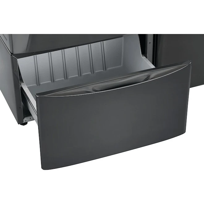 Make loading and unloading your laundry machines easier by raising them to a comfortable height with this Electrolux laundry pedestal. The Luxury-Glide(R) drawer slides smoothly and easily with a touch of a finger. It also has a large usable capacity that provides great storage for all your laundry supplies and keeps them close at hand. The pedestal has a flat-top design that supports your laundry basket when the pedestal is open. It comes in a titanium finish that easily complements your washing machine or dryer and is backed by a 1-year warranty.