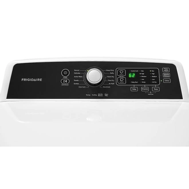 This Frigidaire gas dryer offers 10 drying cycles to take care of all your laundry needs, including a quick dry cycle for faster performance and a sanitize cycle to eliminate bacteria. Choose from 5 dryness levels based on garment care requirements, or select the sensor dry cycle that monitors moisture levels to end the cycle when clothes are dry. Electronic controls make the dryer easy to use, the large capacity lets you dry more in a load, and the stainless steel drum is built for lasting performance.