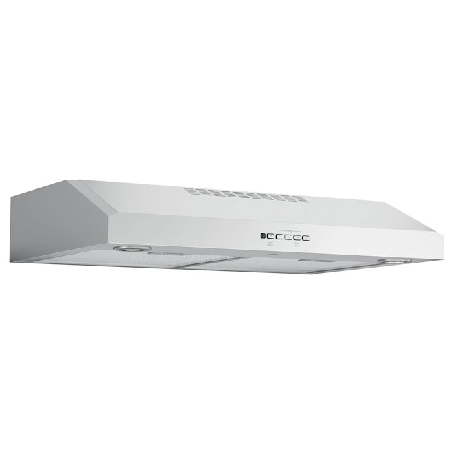 Keep your kitchen odour- and smoke-free with this 30-in GE under cabinet range hood. It features a stainless steel framework for durability and resistance to heat and corrosion. The 310 CFM blower fan is high performing and clears the air of fumes, grease and other pollutants. Its adjustable 4-speed settings cater to varying needs. This 30-in wide under cabinet range hood measures 20-in high and 5 1/2-in deep. It integrates an incandescent lighting to provide for a well-lit cooktop. Removable and easy to clean, the low-maintenance grease filter is safe to wash in the dishwashing machine. This GE Appliances undermount range hood has a back-lit knob control for visibility and intuitive operation. Its stainless steel finish complements a modern, upscale kitchen. It comes with the manufacturer’s 1-year limited warranty.