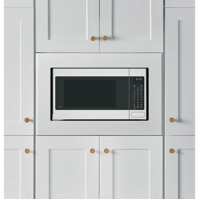 This Café microwave trim kit gives an elegant appearance to any kitchen, elevating your microwave oven from a countertop to a built-in. In addition to the distinct look, it increases the space on your counter making your kitchen seem even bigger. Rear and bottom ducts ensure efficient airflow to the microwave for proper ventilation. Beautiful brushed stainless finish.