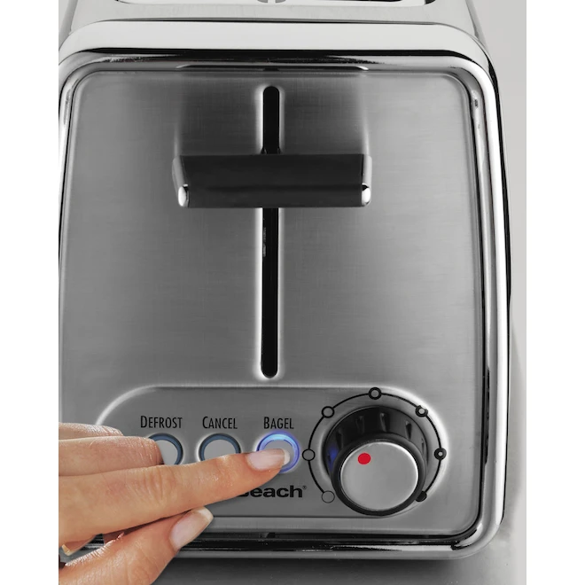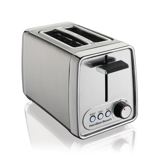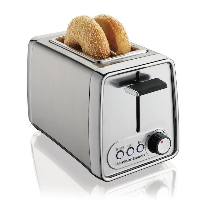 This Hamilton Beach 2-slice toaster features a contemporary design and premium materials with touch controls to cancel, defrost and bake bagels. It includes a dial control with 5 bake settings and a slide-out crumb tray.