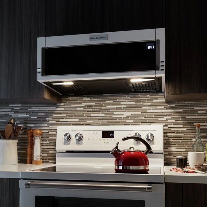 Get this white KitchenAid over-the-range microwave to prepare a wide range of dishes. Its 5-speed dual-fan provides high ventilation performance. The 18 in over-the-range microwave features a touchpad control inside the door. The 12-in turntable offers ample space to cook food evenly.