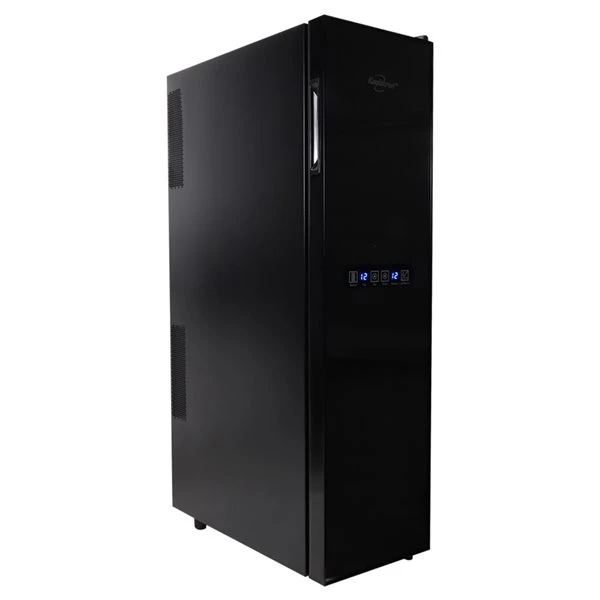 Store your favourite wines at their ideal temperature with Koolatron’s elegant, affordable luxury wine storage. This 18-bottle thermoelectric wine fridge with narrow footprint, removable racks, LED lighting, and UV-blocking glass keeps your wines safe and ready to enjoy. Store up to 8 bottles of red wine in the upper zone at 54-66°F (12-18°C) and up to 10 bottles of white or sparkling wine in the lower zone at 46-66°F (8-18°C).