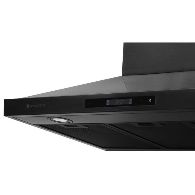 Add a contemporary and refined touch to your kitchen with this 29.5-in Mistral wall mount range hood. Made of black stainless steel, this hood with a vitrified black finish front offers a superb modern sleek design and is easy to clean. Its high-quality aluminum micro-perforated filters are dishwasher safe. This high performance 450 CFM range hood with 3 speeds effectively retains smoke and steam. Your cooking surface will always be well lit with its LED lights. With a circular evacuation of 6 inches, its silent fan is greatly appreciated when in use. Soft touch digital control. This product is backed by a one-year limited warranty on parts.