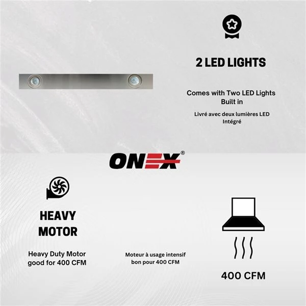 Premium quality with 400 cfm airflow, 2 speed fan, powerful motor, 30-inch duct able range hood will quickly ventilate your kitchen and keep the noise level as low as 52 dB to bring you an amazing cooking experience. ONEX® range hood comes with aluminum mesh filter. The aluminum mesh filter is easy to pop out and can be places in the dishwasher for easy to clean. The aluminum mesh filter trap smoke and cooking grease/oil efficiently. Leaves your kitchen clean with fresh air. Easy to use push-button control panel makes it extremely easy to operate for anyone. ONEX offers heavy-duty fans with three speed controls for every kind of cooking. It is suitable for different cooking methods. Comes with 2 x 2 W LED lights to make your cooking area brighter.