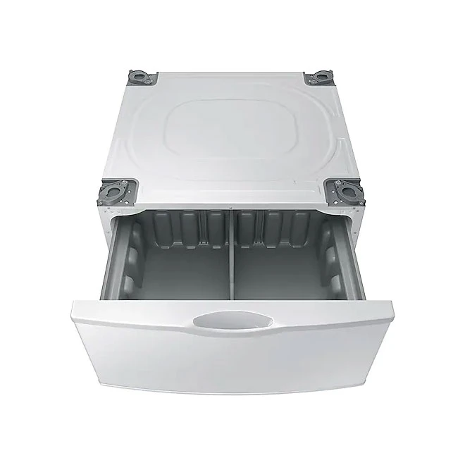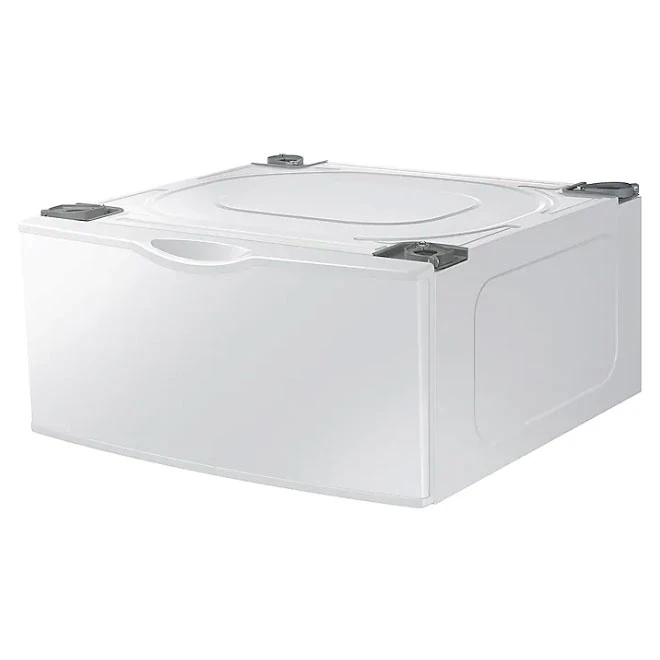 This Samsung(R) laundry pedestal makes laundry day easier by eliminating the stress and strain of bending and reaching. The pedestal works with your front-load washer or dryer to raise the machine to a more convenient working height. It features a handy storage drawer that keeps laundry essentials tucked away, while still leaving them in one, easy-access place. The drawer has an adjustable divider so you can maximize the space to suit your needs. It also includes an ergonomic handle for comfort. This white-coloured pedestal is easy to install and is designed for WF45M5100AW washer and DV42H5000EW dryer (sold separately). This product is backed by a 1-year limited warranty.