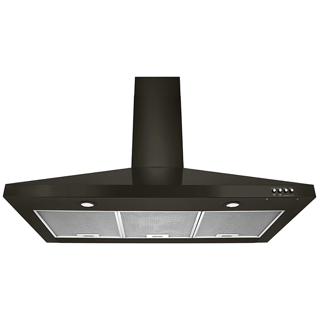 Add a touch of modernity to your kitchen space thanks to this Whirlpool(TM) wall mount chimney range hood. Its black stainless steel finish offers superior resistance to fingerprints for quick and easy cleaning. With a width of 36″, it features a 3-speed motor that allows the three fans to generate 400 CFM of suction power while emitting only 44 to 66 dBA depending on the speed. This range hood is equipped with a LED lighting system for optimal visibility, and dishwasher-safe grease filters. In addition, you can choose to evacuate the vacuumed air outside or to recirculate it inside; charcoal filters would then be required (not included). This product is backed by a 1-year limited warranty on parts and labour.